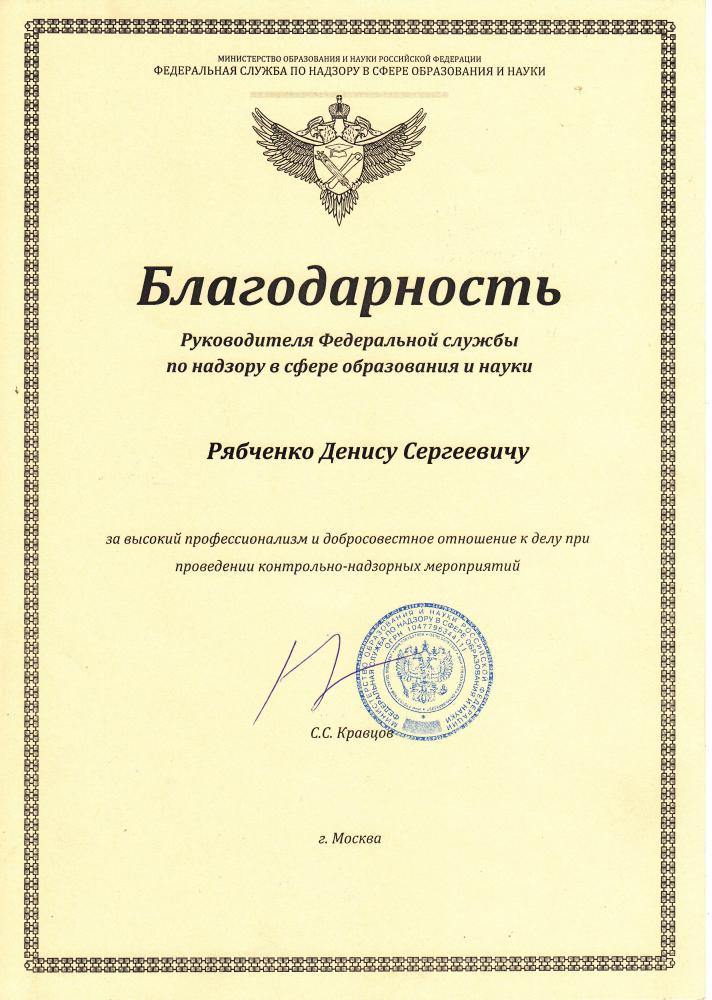 Рябченко Д.С. объявлена благодарность руководителя Рособрнадзора