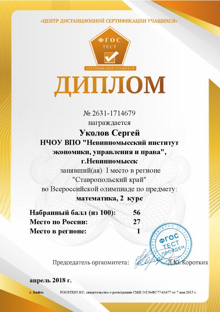 Уколов Сергей (группа БИД-15Б) занял 2 место по региону «Ставропольский край» во Всероссийской олимпиаде по предмету математика.