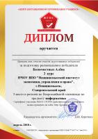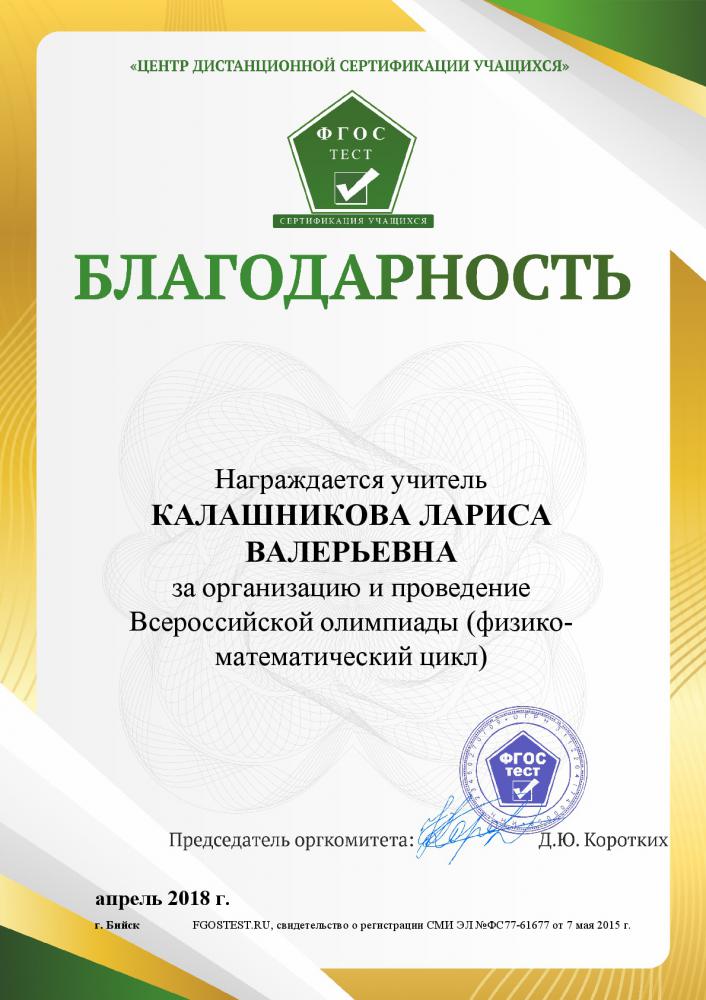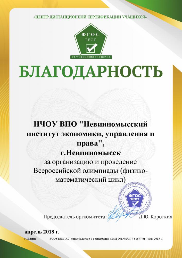 НЧОУ ВО «Невинномысский институт экономики, управления и права» и преподаватель Калашникова Лариса Валерьевна получили от председателя комитета конференции благодарность за организацию и проведение Всероссийской олимпиады (физико-математический цикл).