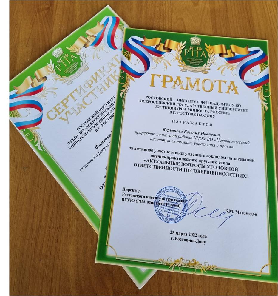 Проректор по научной работе НИЭУП канд. юрид. наук Бурьянова Евгения Ивановна и заведующая кафедрой Юридических дисциплин канд. юрид. наук, доцент Фоменко Ирина Владимировна приняли участие в заседании круглого стола «Актуальные вопросы уголовной ответственности несовершеннолетних», который состоялся в Ростовском институте (филиале) ВГУЮ (РПА Минюста России).
