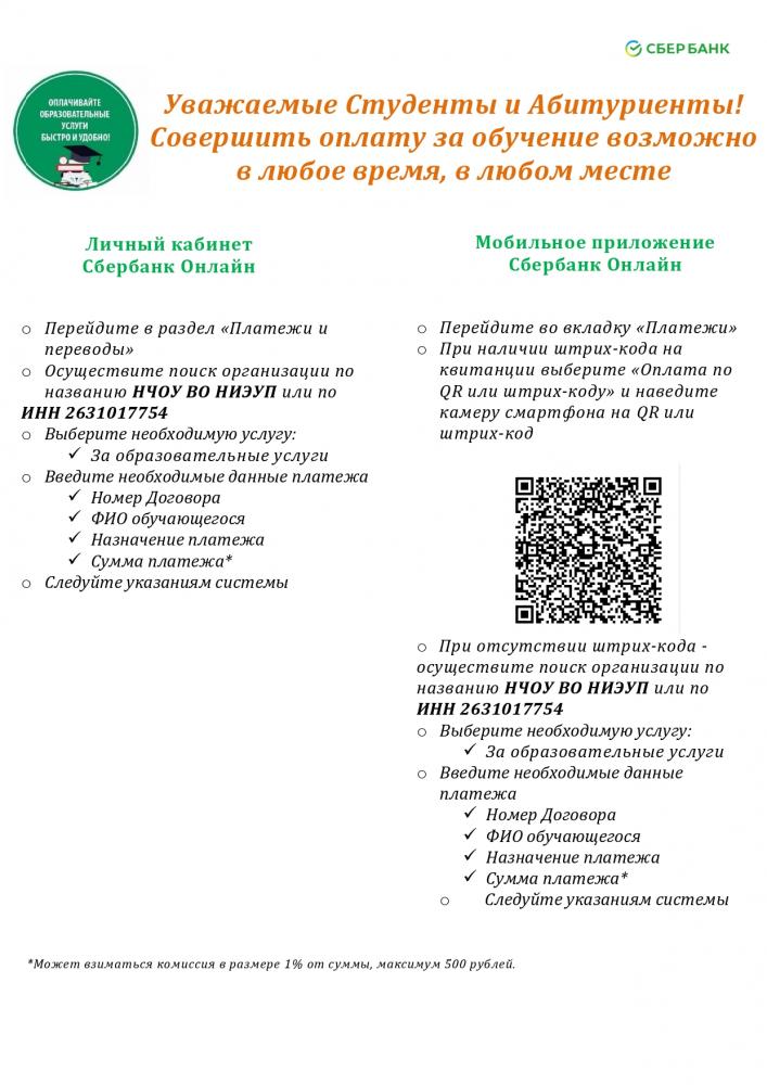 Уважаемые студенты и абитуриенты! В связи с участившимися обращениями по поводу оплаты обучения через мобильное приложение Сбербанка, уведомляем Вас, что на сайте НЧОУ ВО НИЭУП в разделе Документы - Платные образовательные услуги размещена инструкция по оплате услуг через личный кабинет Сбербанк Онлайн и мобильное приложение Сбербанк Онлайн, а также размещен штрих-код для оплаты. Для удобства и исключения ошибок в реквизитах пользуйтесь данной инструкцией и штрих¬кодом.