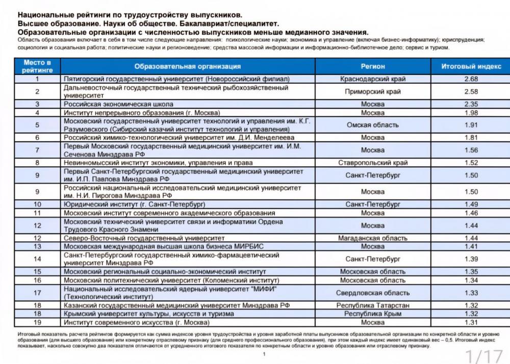 Рейтинг основан на фактических данных Рособрнадзора о выпускниках по уровню их трудоустройства и величине их заработной платы. Итоговый индекс трудоустройства выпускников Невинномысского института экономики, управления и права составил — 1,52